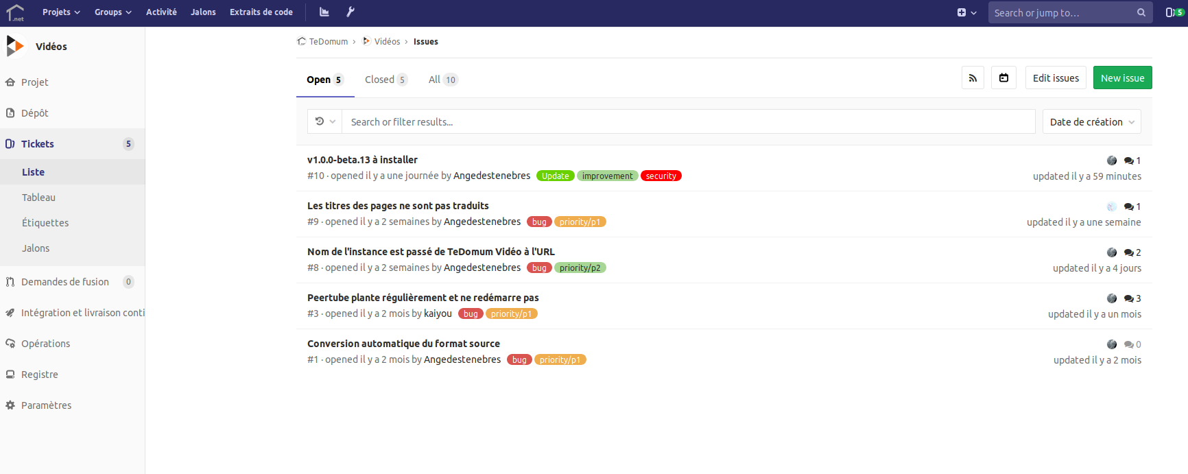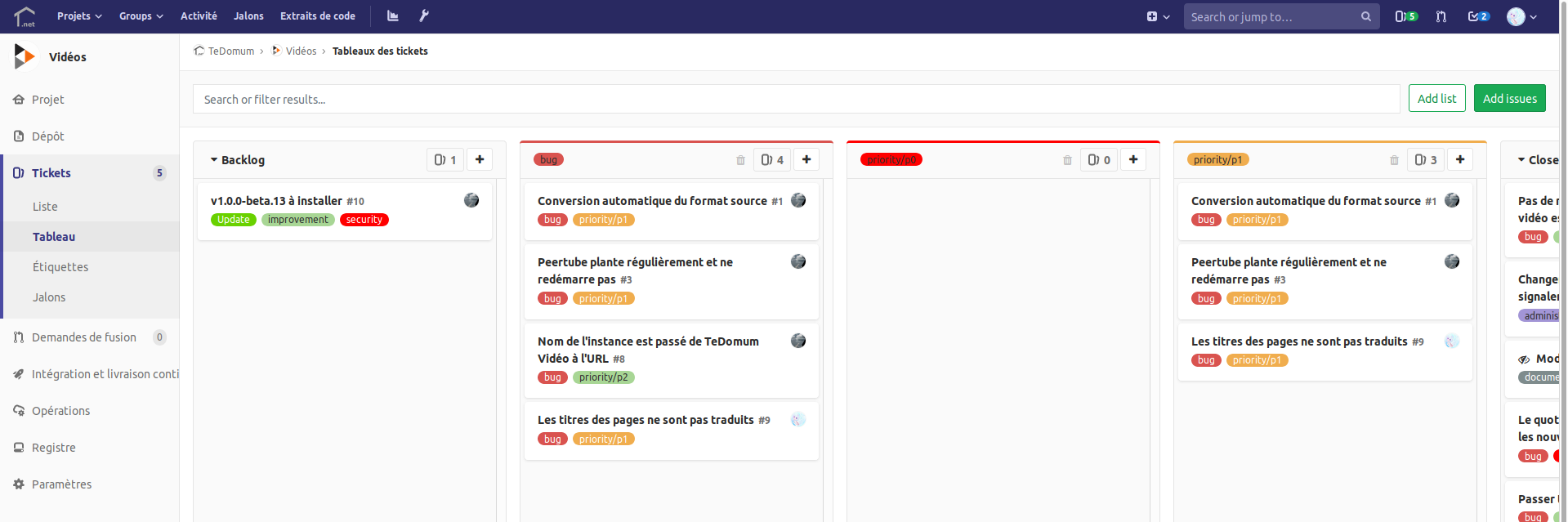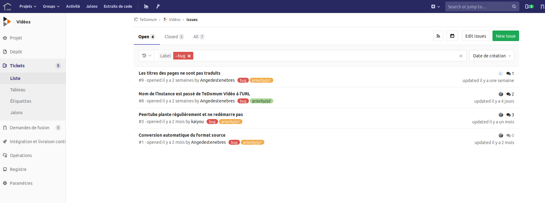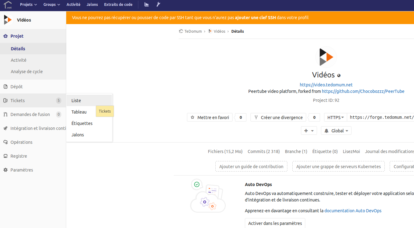 Les tickets sont gérés par projet. Pour y accéder, il faut donc sélectionner un projet. Exemple avec PeerTube :