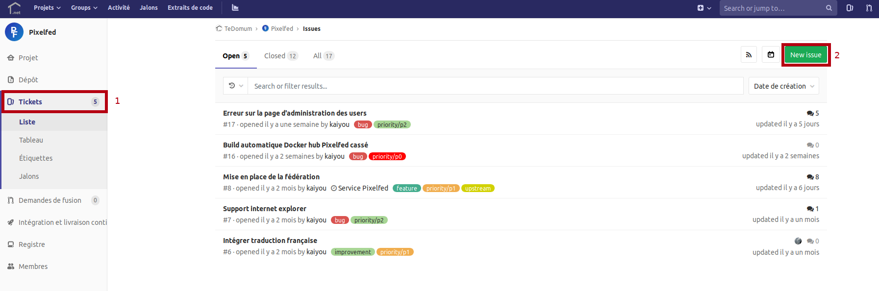 Pour créer un ticket, il faut tout d’abord sélectionner le projet pour lequel un ticket doit être ouvert. Par exemple, si vous rencontrez un problème avec PixelFed, il suffit alors de sélectionner le projet TeDomum / Pixelfed, d’aller dans la partie tickets et de cliquer ensuite sur New Issue :