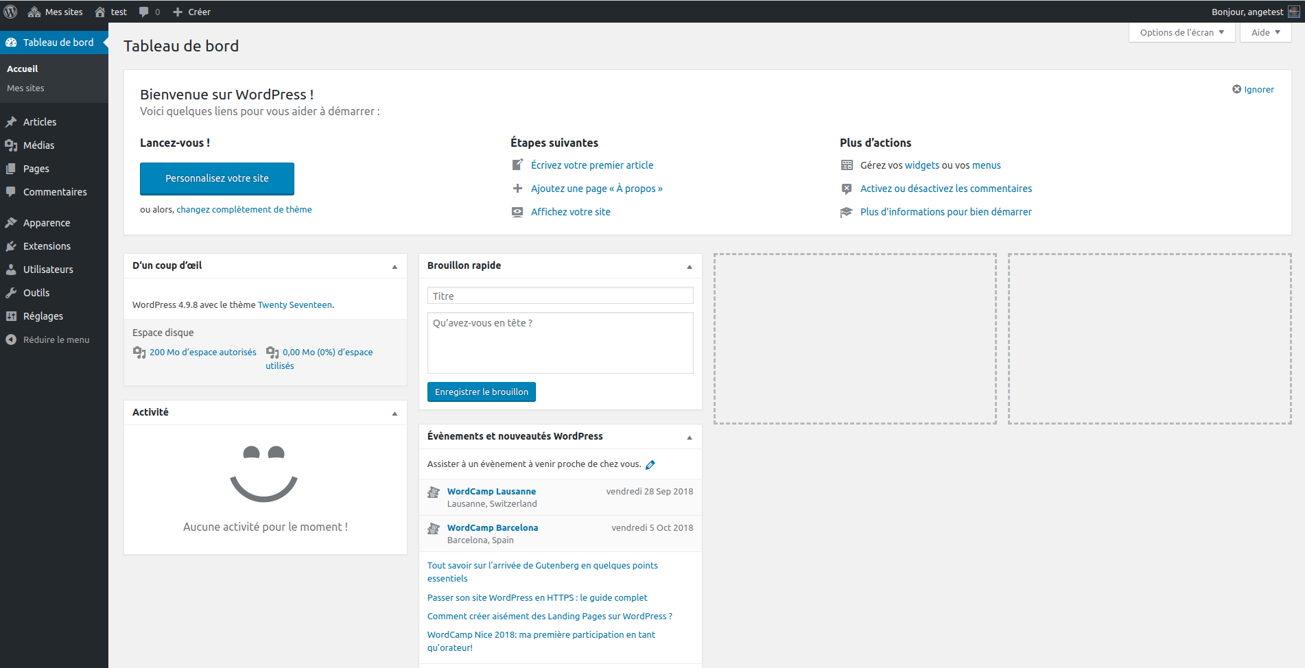 Tableau de bord: contient différentes informations sur vos sites et informations WordPress ;Articles: permet de gérer vos articles ;Média: permet de gérer vos fichiers. À noter que de base, vous disposez d’un espace de 200 Mo sur TeDomum ;Pages: permet de gérer vos pages ;Commentaires: permet de gérer les commentaires de votre site ;Apparence: personnaliser l’apparence de votre site ;Extension: pour activer ou désactiver des options supplémentaires ;Utilisateurs: gérer les utilisateurs qui ont un compte sur votre site et leurs droits ;Outils: pour l’import/export de données, la gestion des noms de domaine ou encore la suppression définitive du site ;Réglages: pour définir divers paramètres sur votre site.