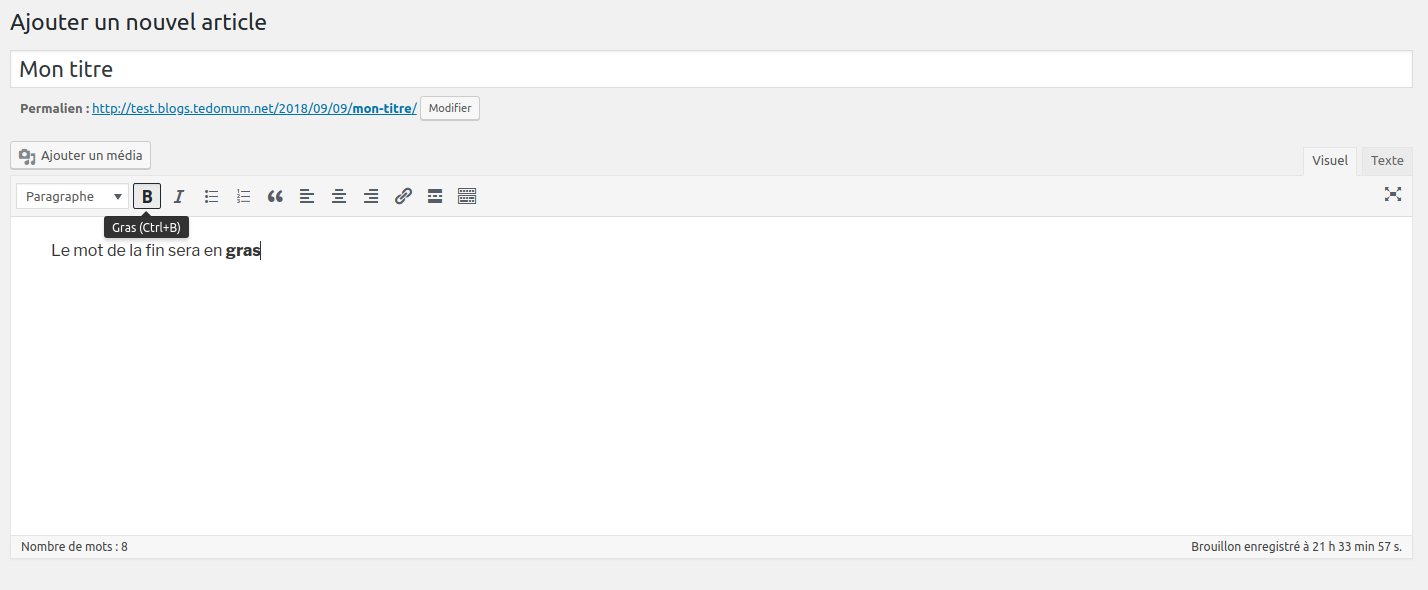 C’est celui visible par défaut (onglet visuel). Il permet d’éditer votre page web simplement comme si vous étiez sur un logiciel de traitement de texte :