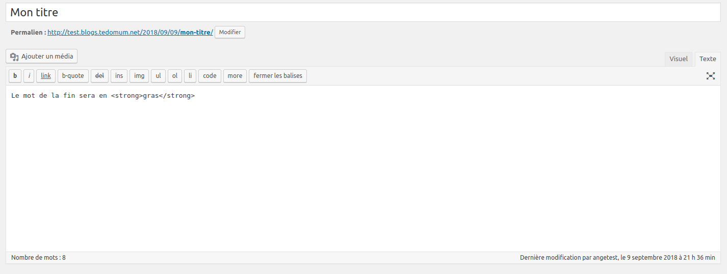 Il est possible d’activer cet éditeur en allant sur l’onglet texte. Dans ce cas, vous aurez alors le code source (HTML) de la page ou de l’article en cours d’édition. Voici ce que cela donne en reprenant l’exemple ci-dessus :