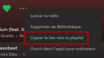 Il suffit de copier le lien de la playlist/musique directement dans l’éditeur visuel pour que cela fonctionne. Pour récupérer le lien d’une playlist/musique, il suffit de cliquer sur les ... puis Copier le lien [...] comme ci-dessous :
