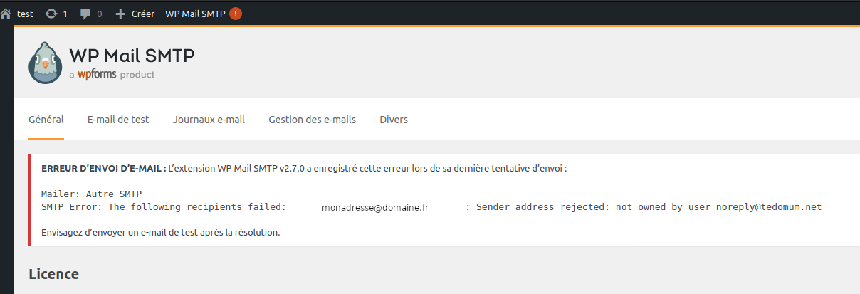 Du côté de l’interface admin, l’erreur suivante sera affichée par WP Mail SMTP :