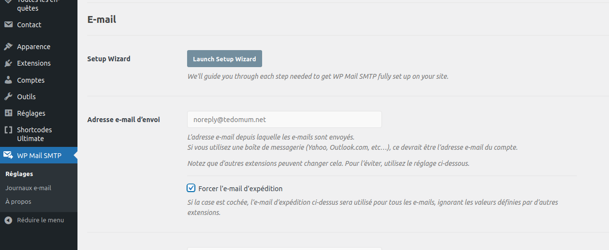 Le message annonce simplement que Wordpress essaye d’envoyer un mail avec votre adresse monadresse@domaine.fr au lieu de l’adresse noreply@tedomum.net qui est la seule autorisée. Pour corriger ce problème, il faut aller dans les réglages de WP Mail SMTP et dans la partie concernant l’adresse d’envoi, cocher simplement la case Forcer l’e-mail d’expédition comme ci-dessous :