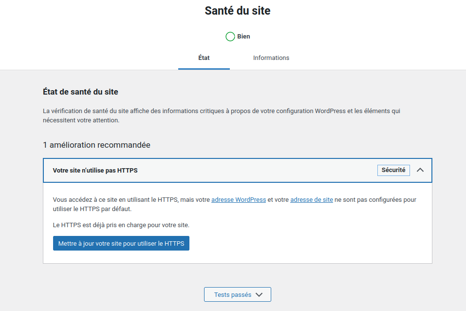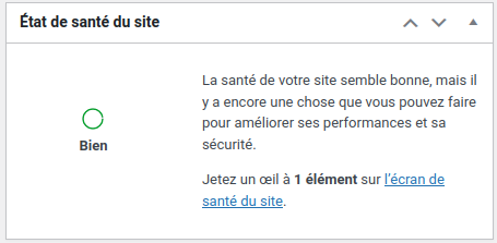 1. Sur la page d’accueil du tableau de bord, regarder l’état de santé du site et cliquer sur le lien menant à l’écran :