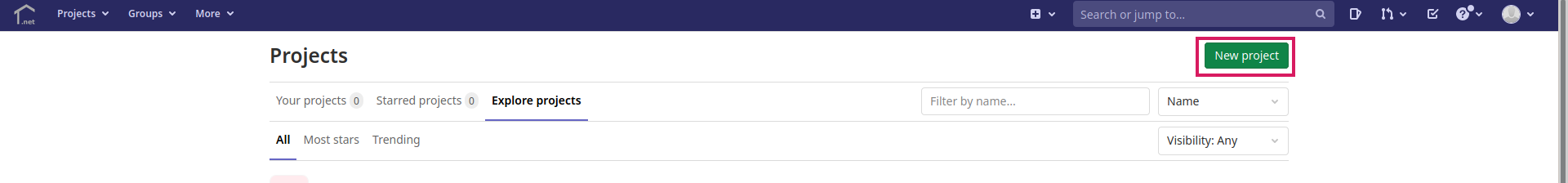 Après vous être connecté via Hiboo, une page listant les projets publics (ou privés auxquels vous avez accès) s’affichera. Si vous souhaitez créer votre propre projet, il suffit alors de cliquer sur le bouton New project :