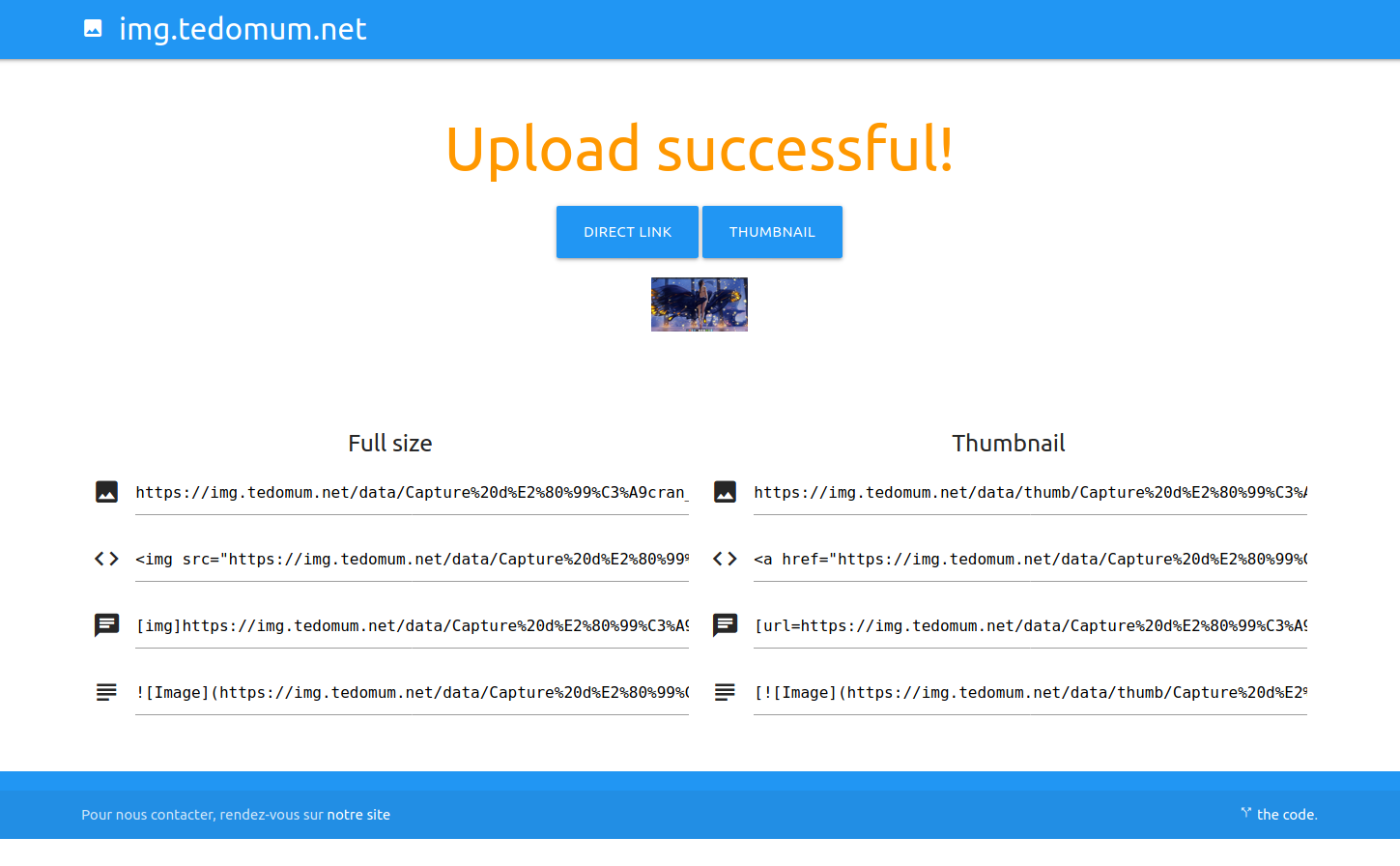 Plusieurs codes de partage prêts à l’emploi sont disponibles, à gauche pour utiliser l’image « full size » (grandeur nature) et à droite « thumbnail » (miniature), avec dans l’ordre :