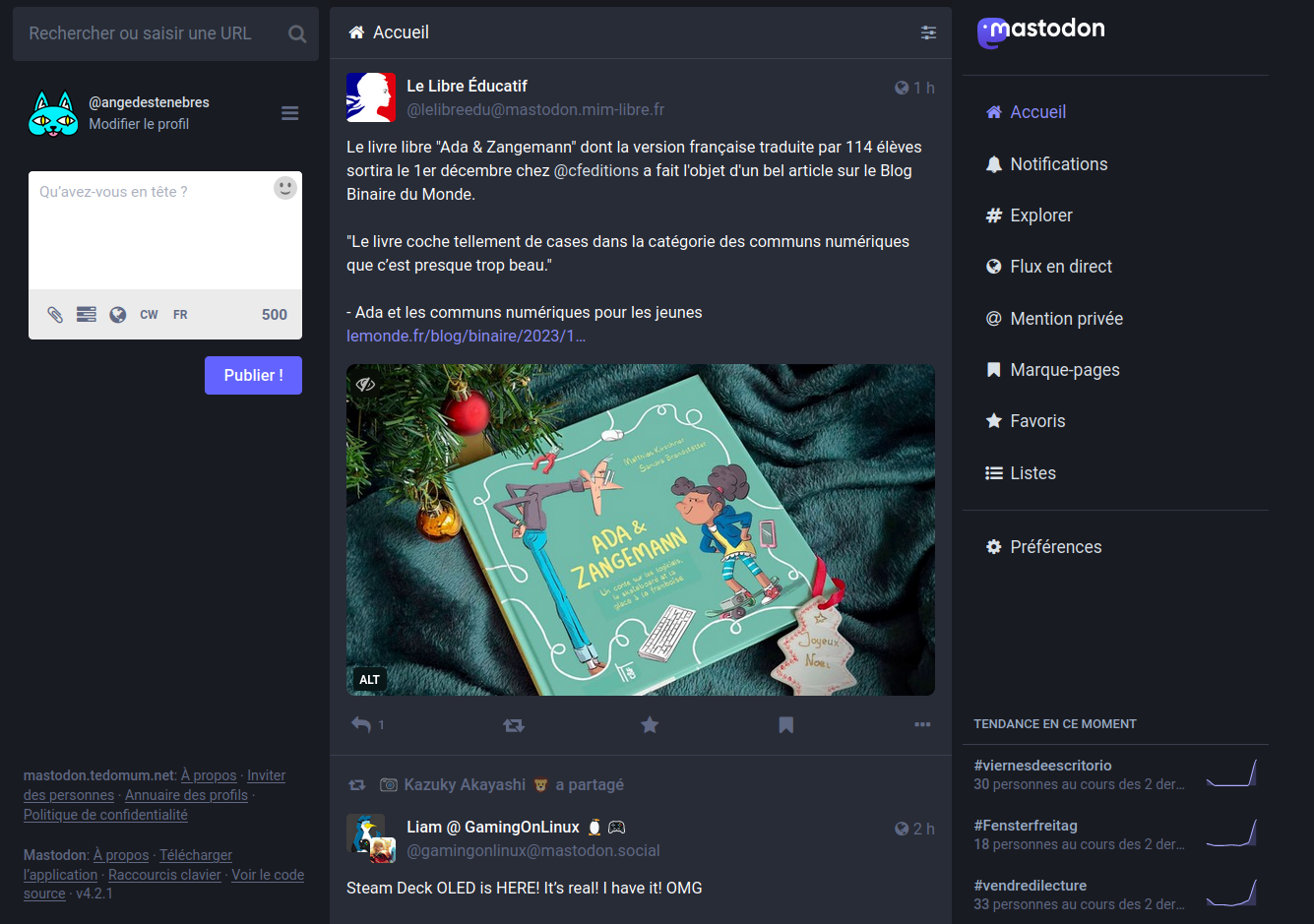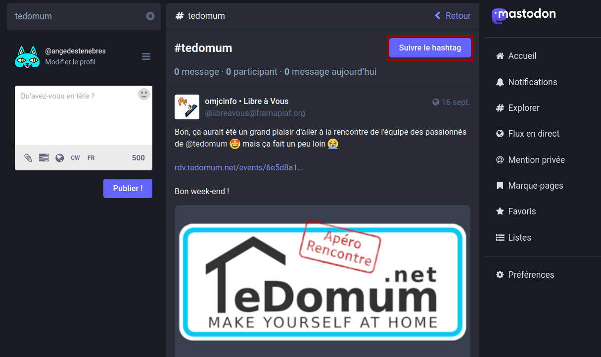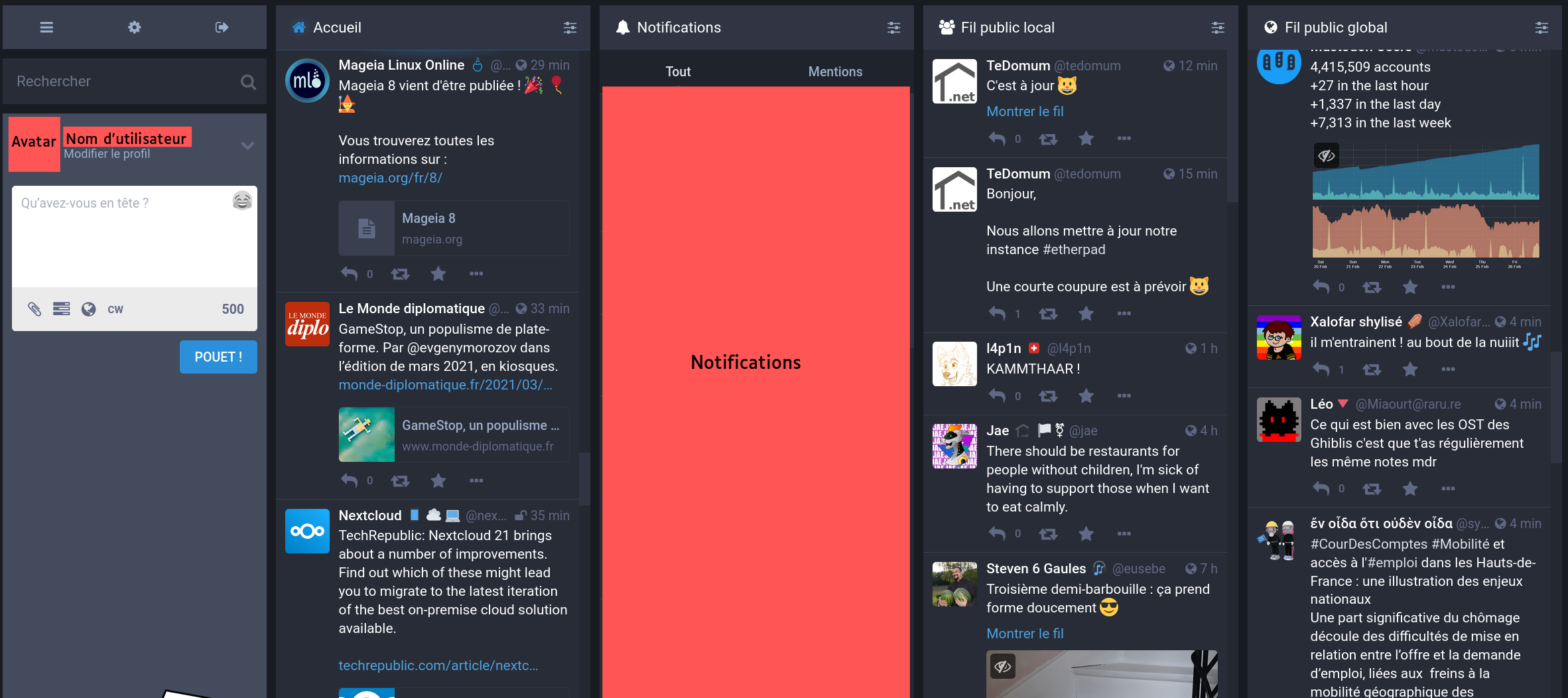 - Tout : L’ensemble des messages de l’instance et du fediverse.