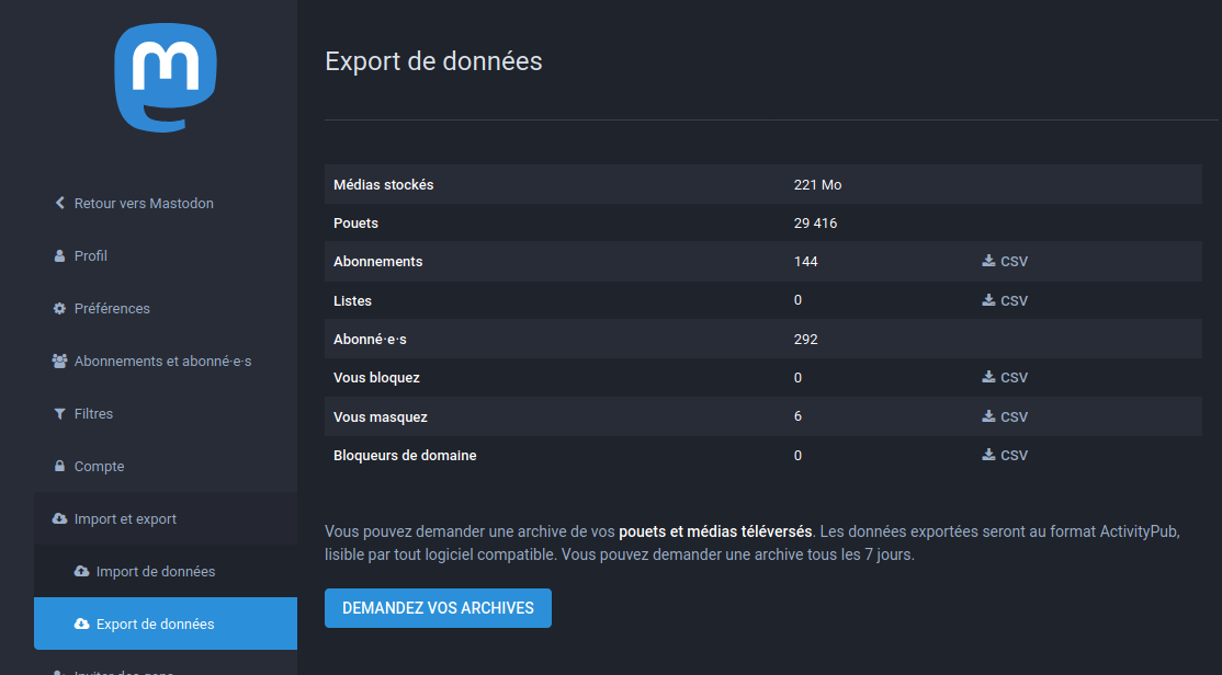 Cela peut être utile dans le cas où vous souhaitez déménager (vers une autre instance) ou supprimer votre compte pour garder un historique. Pour se faire, il faut aller dans les Préférences :