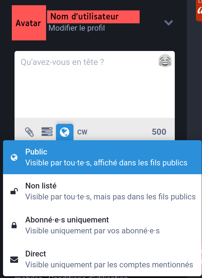 - Public : votre pouet apparaît dans le fil de vos abonnés, mais aussi dans le fil public local et le fil public global.