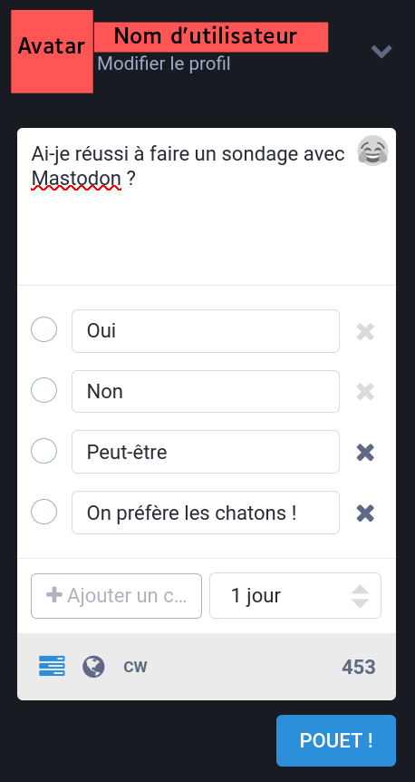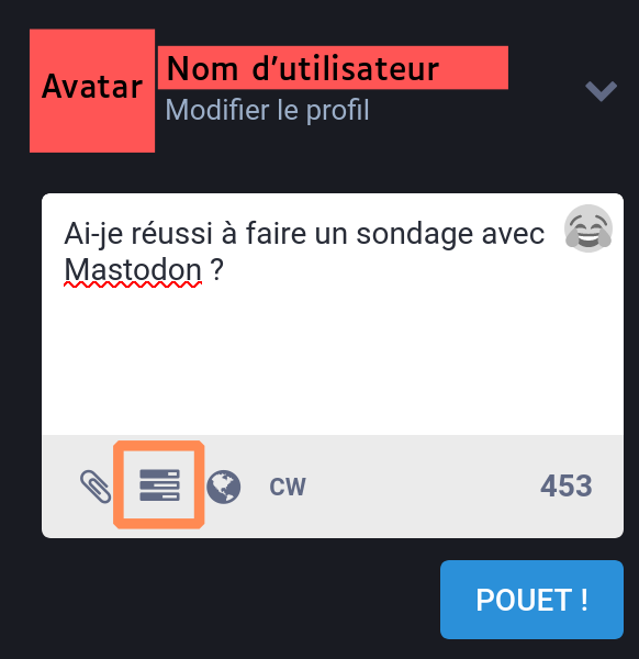 Il est possible de créer des sondages sur Mastodon en utilisant le bouton indiqué par un carré orange :