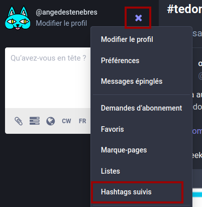 Pour se désabonner, la manipulation est similaire. On peut voir la liste des hashtags suivis en cliquant sur le menu burger à côté de de son d’utilisateur, puis en sélection le menu dédié comme ci-dessous :