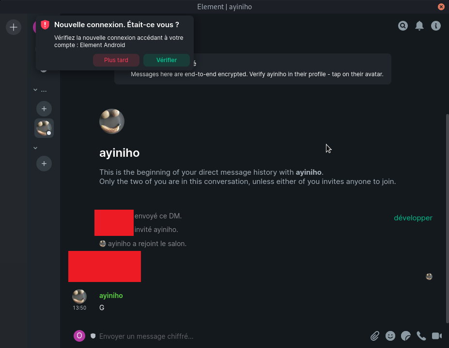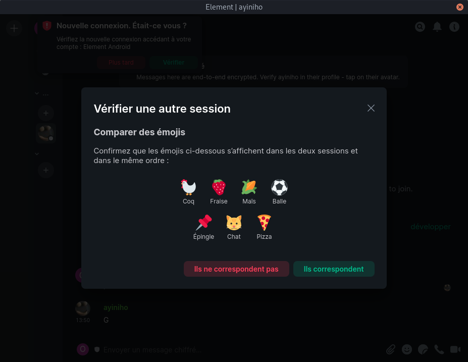 • La vérification des appareils : lorsque l’on se connecte avec un nouvel appareil, il devrait être suggéré de procéder à sa vérification. Elle sert à s’assurer que tous les appareils sont bien en notre possession et donc de s’assurer que personne n’ait piraté notre compte. Pour cela, l’application (Element ici) demandera de scanner un QR code ou de comparer des emojis entre les appareils. Une fois un appareil vérifié, il va automatiquement demander les clés qui lui manquent aux autres et les récupérer. Les anciens messages seront alors lisibles (sauf bugs ponctuels) :