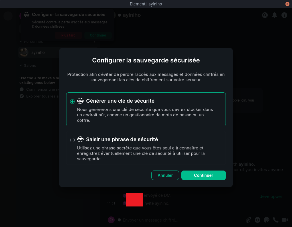 • La sauvegarde des clés sert à se protéger dans le cas où l’on perdrait, se ferait voler un appareil ou encore si l’on se déconnecte de toutes nos sessions (et donc tous nos appareils). Element propose de l’activer normalement sur le premier appareil lorsque l’on se connecte et demande de saisir un mot de passe de sauvegarde. Si cela a bien été fait, il sera possible de demander une restauration via l’onglet vie privée de chacun des appareils avec ce même mot de passe.
