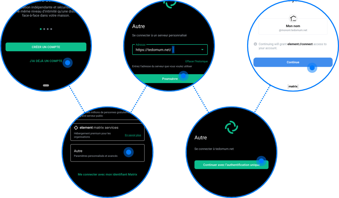 Attention : Vu que notre instance matrix est reliée à Hiboo, notre SSO, il faut que le client utilisé supporte le SSO pour cela fonctionne. Ce n’est malheureusement pas le cas de tous à ce jour. Concernant Element sur mobile : Il faudra vous rendre dans Autre → Indiquer le serveur tedomum.fr → Puis finaliser l’inscription.