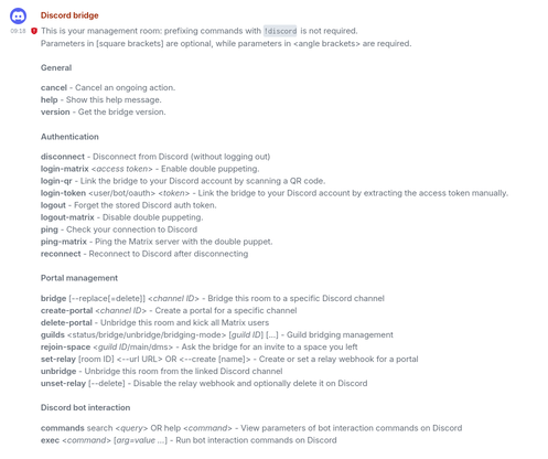 Pour plus d’informations sur les commandes disponibles, envoyez !discord help dans la conversation avec le bot.