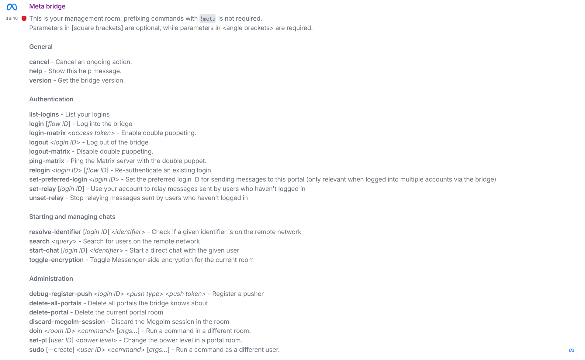 list-logins: Liste toutes les connexions actives associées à votre compte Matrix.login: Connectez-vous au bridge Meta.logout <login ID>: Déconnectez un compte Meta spécifique du bridge.ping-matrix: Vérifiez la connexion entre le serveur Matrix et le bridge.relogin <login ID>: Ré-authentifiez une connexion existante.set-preferred-login <login ID>: Définissez un identifiant de connexion préféré pour l’envoi des messages.