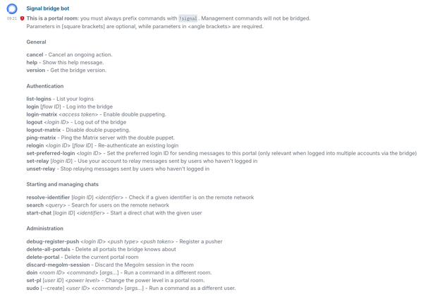 list-logins: Liste toutes les connexions actives associées à votre compte Matrix.login: Connectez-vous au bridge Signal.logout <login ID>: Déconnectez un compte Signal spécifique du bridge.ping-matrix: Vérifiez la connexion entre le serveur Matrix et le bridge.relogin <login ID>: Ré-authentifiez une connexion existante.set-preferred-login <login ID>: Définissez un identifiant de connexion préféré pour l’envoi des messages.