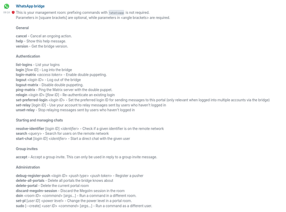 Pour plus d’informations sur les commandes disponibles, envoyez !whatsapp help dans la conversation avec le bot.