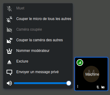 Par défaut, la personne qui a créé la conférence est modératrice, c’est-à-dire qu’elle peut exclure d’autres personnes ou couper le micro des intervenants en cas d’écho ou autres interférences par exemple.