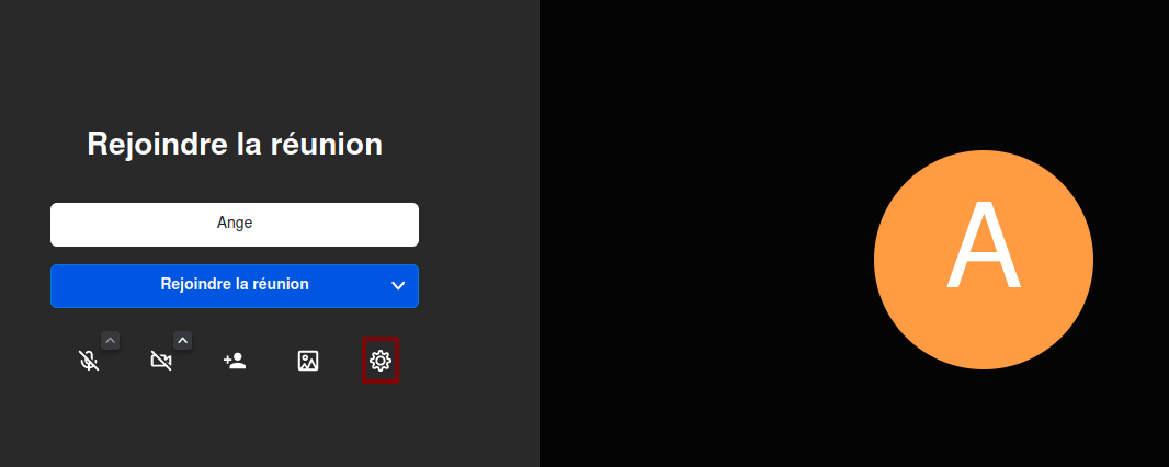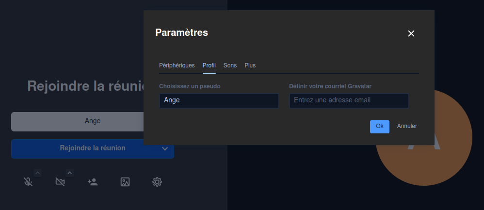 Paramètresavec une roue dentée (comme à la page d’introduction) permet de choisir les périphériques audio et vidéo, de choisir/changer son pseudo, et de sélectionner la langue de l’interface.