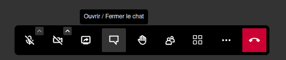 Le quatrième bouton avec un phylactère concerne le chat ; si on clique dessus, une colonne s’ouvre à gauche. Le chat permet d’échanger des liens ou poser des questions sans interrompre la conversation en cours. De plus, il permet à une personne ayant un problème de micro de se signaler. Si votre chat n’est pas ouvert et qu’un ou plusieurs messages sont laissés dessus, alors un chiffre indiquant le nombre de messages non lus sera indiqué à côté de l’icône comme ci-dessous :