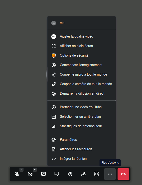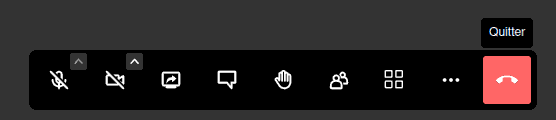 Pour gérer le reste des options de votre conférence, tout se passe via le bandeau affiché en bas de l’écran. On a vu les 2 premiers (micro, caméra : mute) et celui des participants. Ci-dessous, les fonctionnalités des différents boutons.