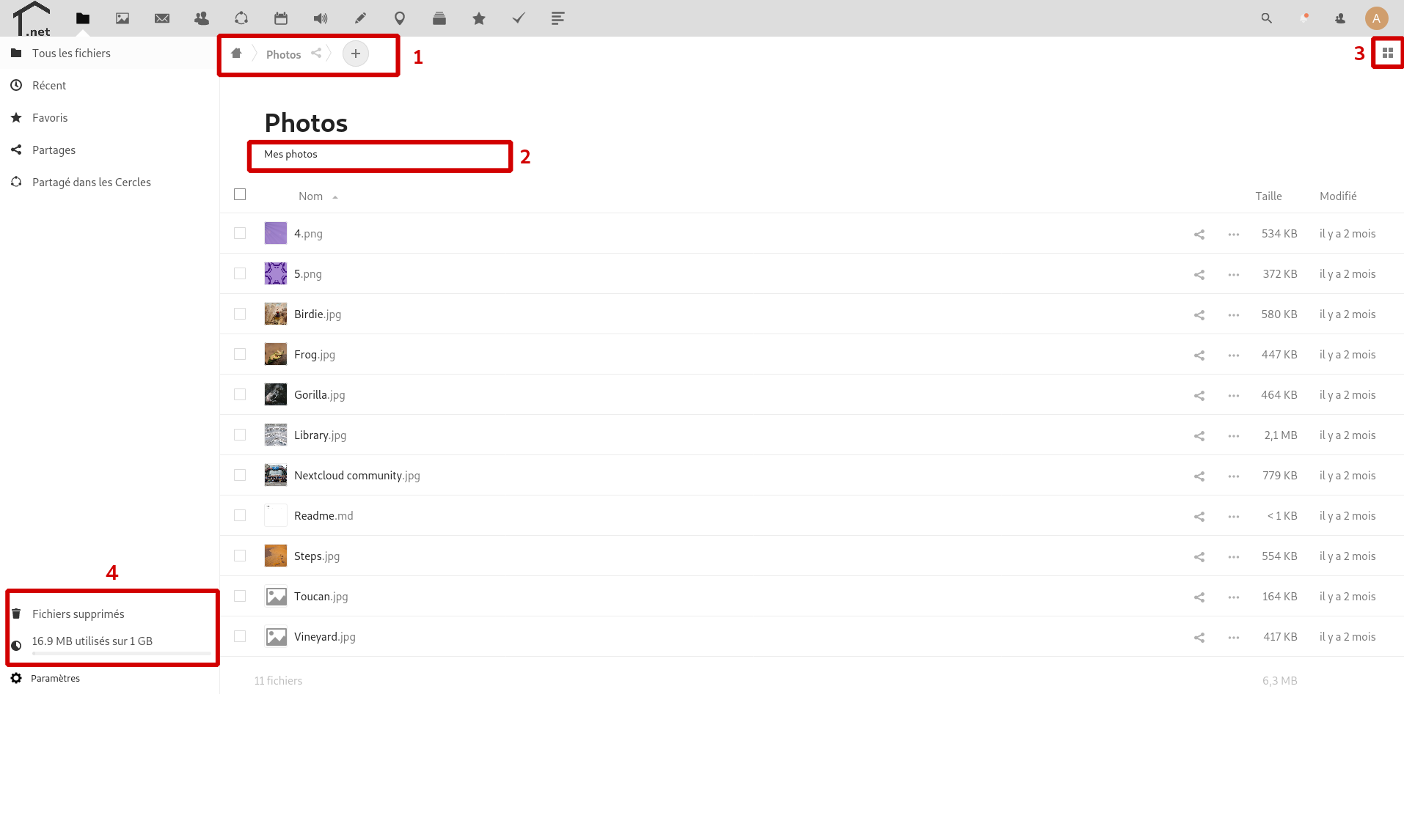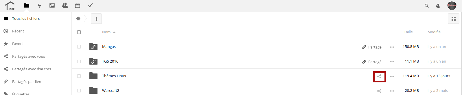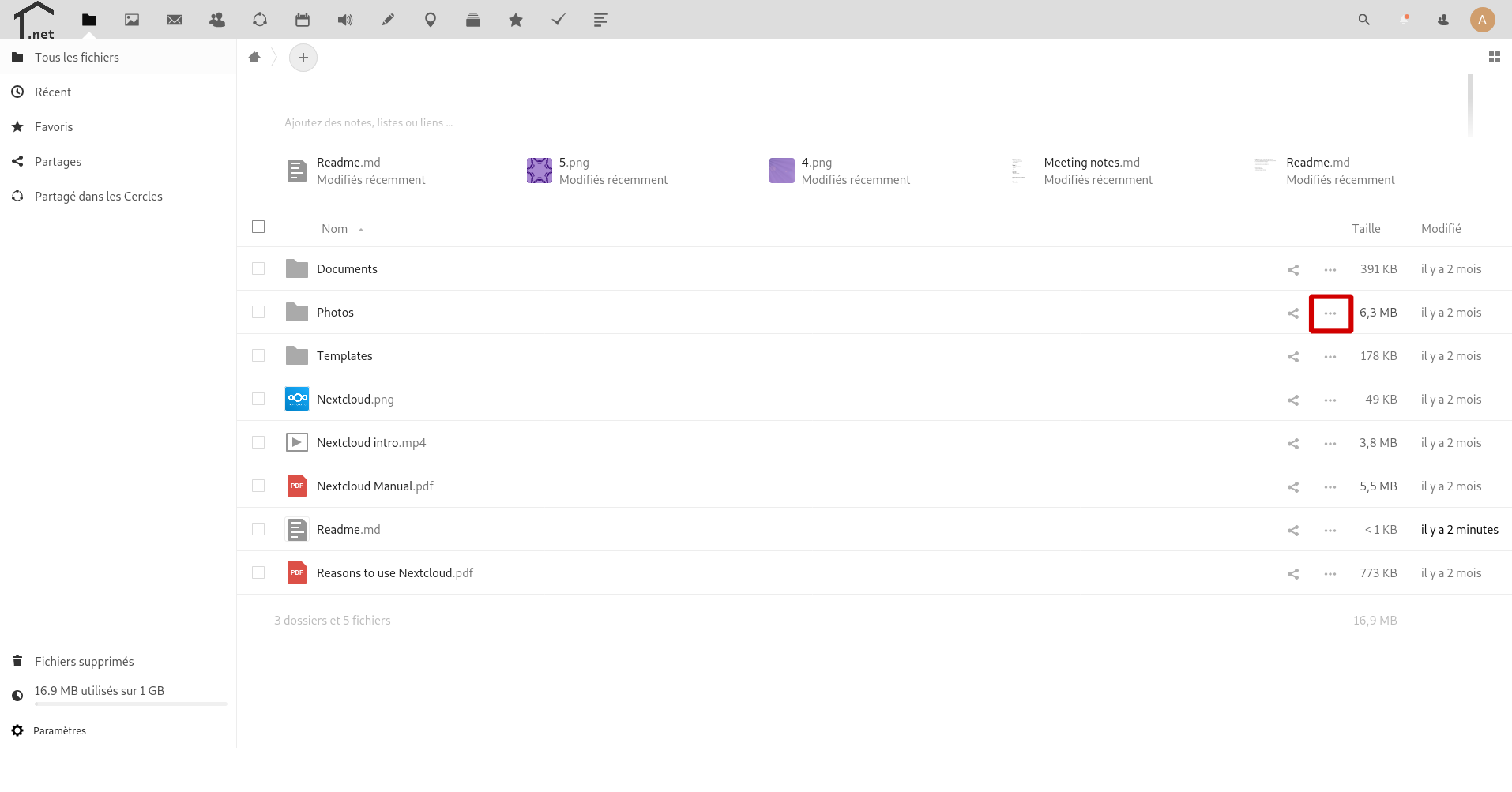 L’interface est assez similaire à l’explorateur de fichier que l’on peut rencontrer sous Windows, Linux ou MacOS. Les trois points indiqués par l’encadré rouge permettent de voir les détails du dossier, de gérer les options de partage ou encore d’ajouter le fichier ou le dossier dans les favoris.