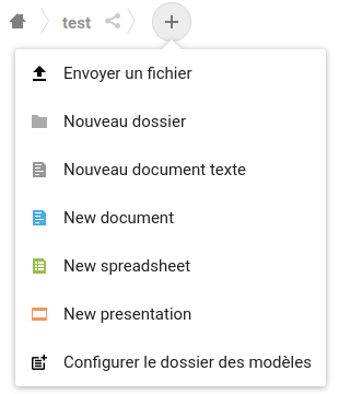 À la création, seuls les formats proposés par LibreOffice (odt, ods, odp) seront proposés. La dernière entrée permet de créer un dossier où seront stockés des modèles types de documents.