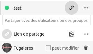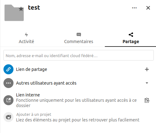 Nextcloud permet de partager un élément avec un autre utilisateur, un groupe, un cercle ou avec tout le monde.