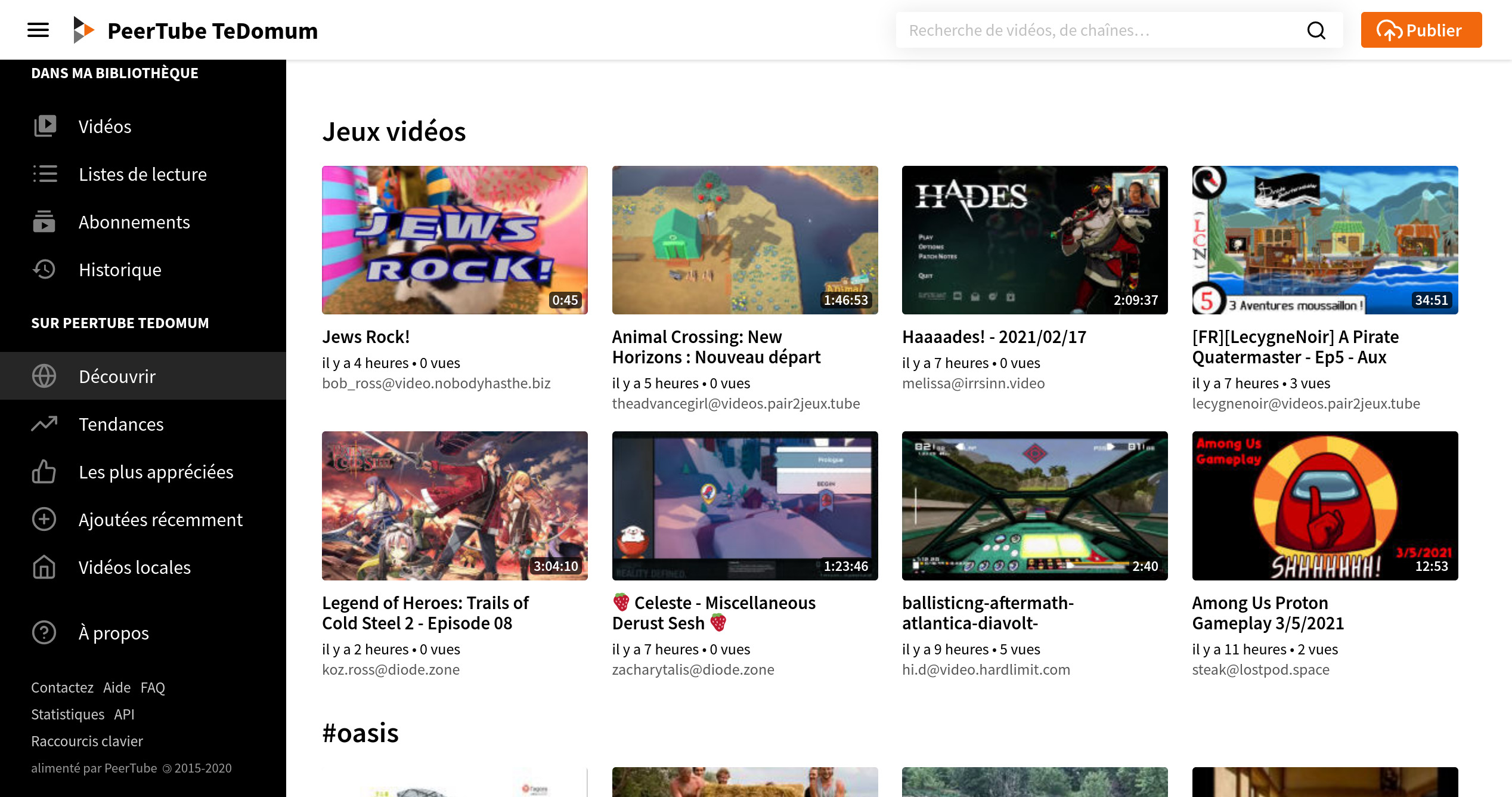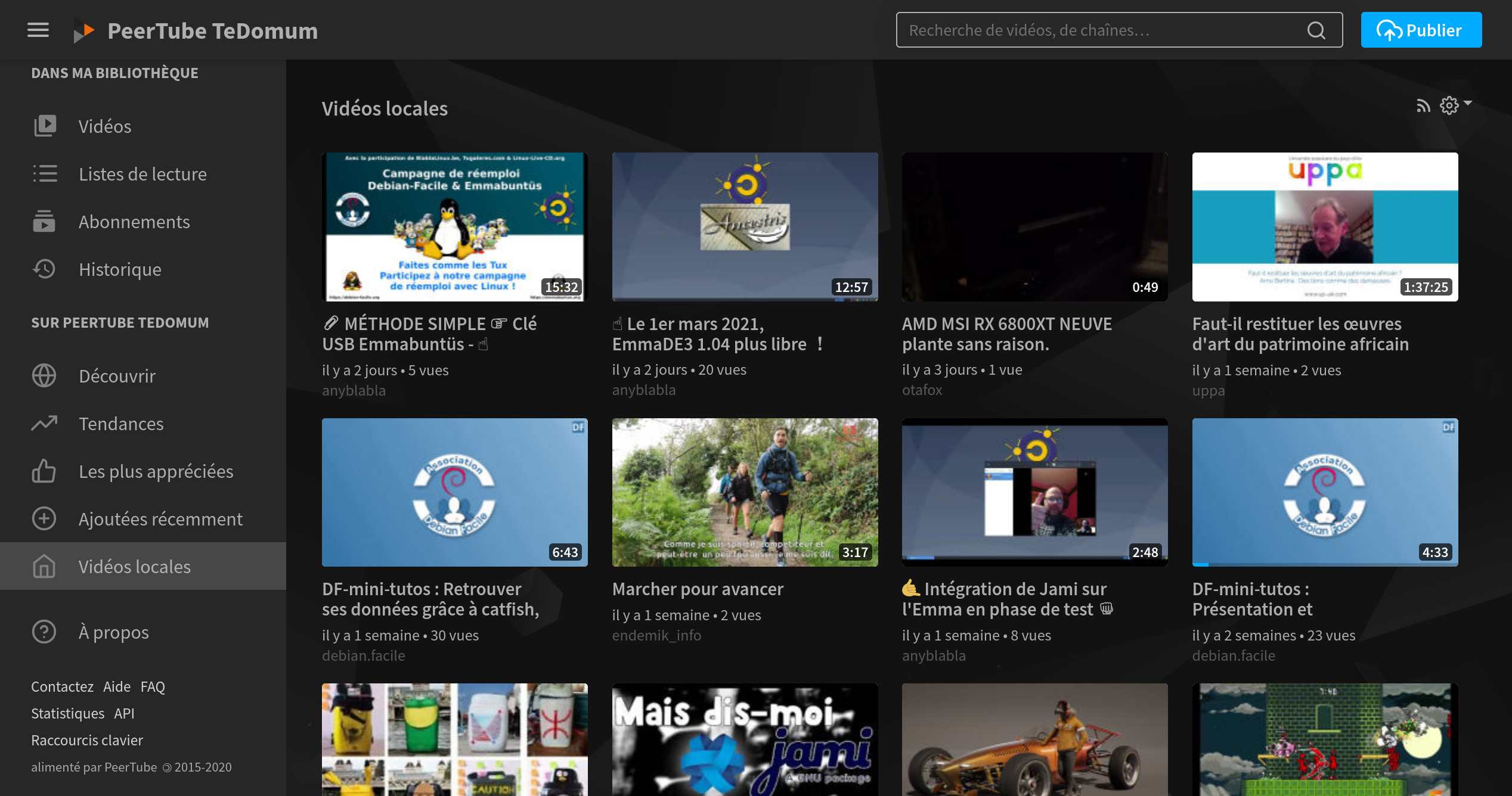Vidéos:Découvrir: liste les vidéos en fonction de leur thématique,Tendancesles vidéos ayant le plus de vues (toutes instances confondues),Les plus appréciées: les vidéos les mieux notées,Ajoutées récemment: les dernières nouveautés (toutes instances confondues),Vidéos locales: affichera uniquement les vidéos de l’instance TeDomum ;