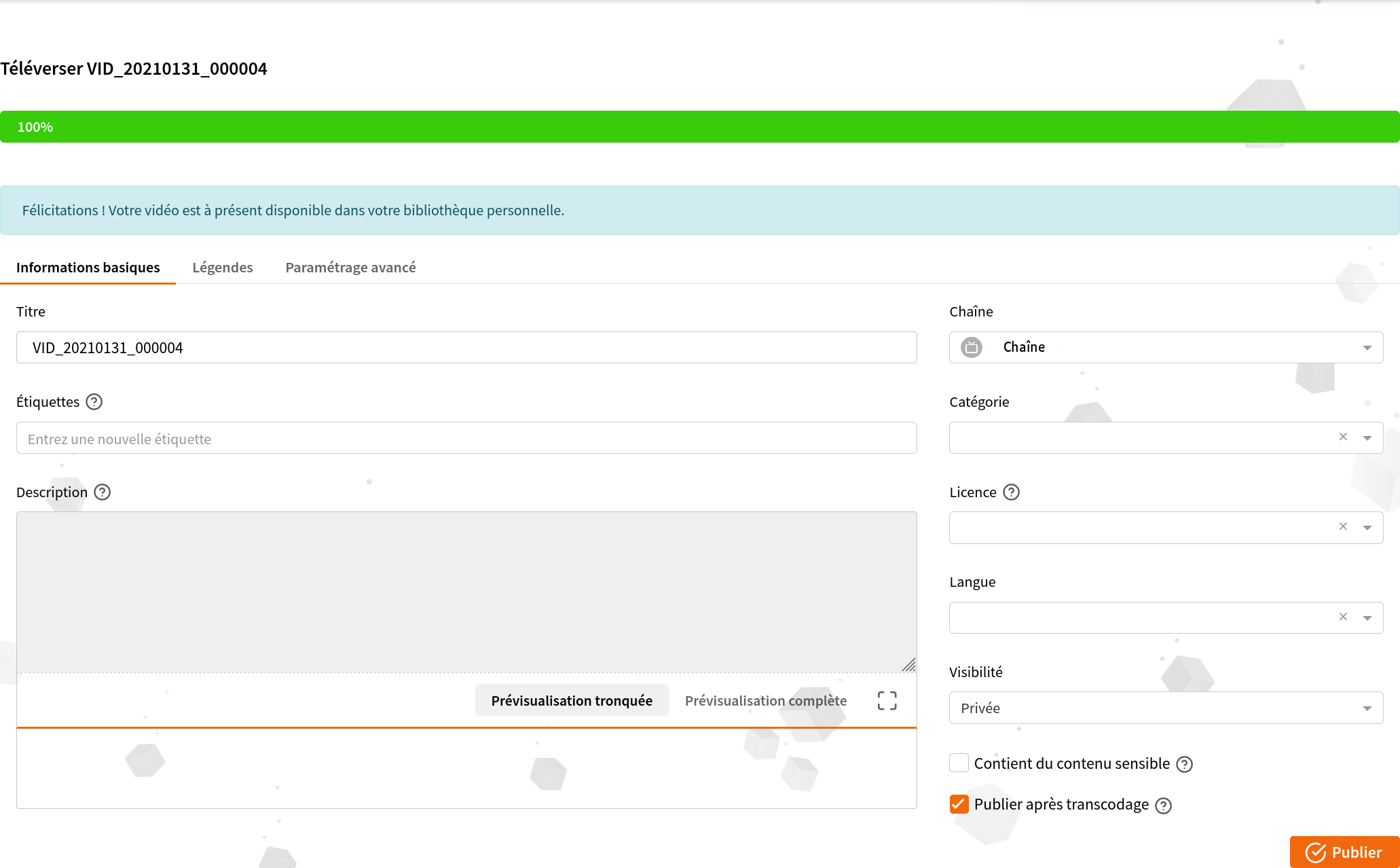 Sélectionnez l’onglet Téléverser un fichier, puis la vidéo que vous souhaitez mettre en ligne et son upload commencera. Vous aurez alors l’affichage suivant :