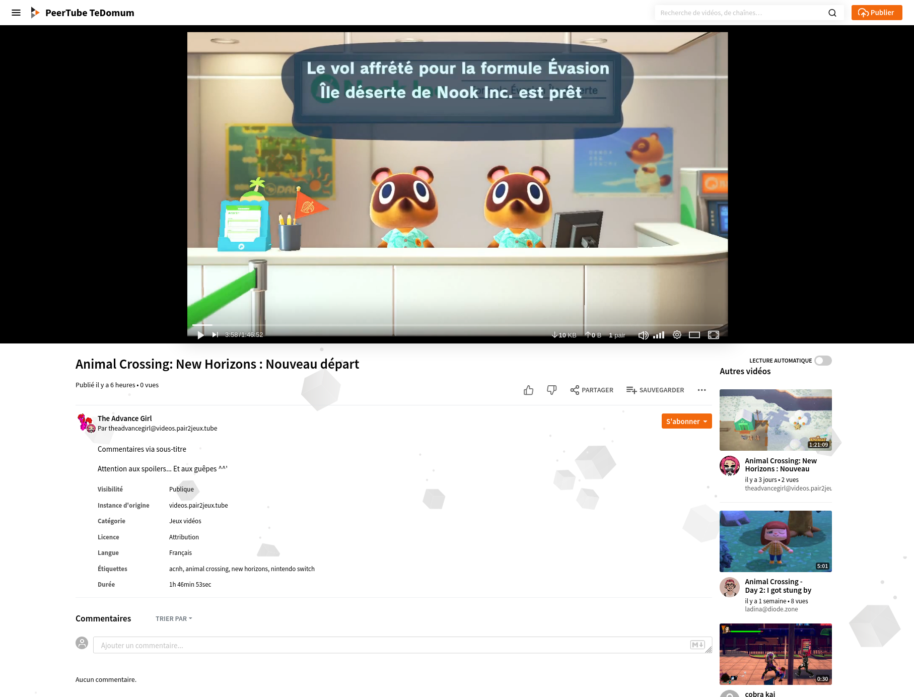 À propospour les informations sur l’instance, accéder à la documentation de PeerTube et à la liste des instances fédérées.