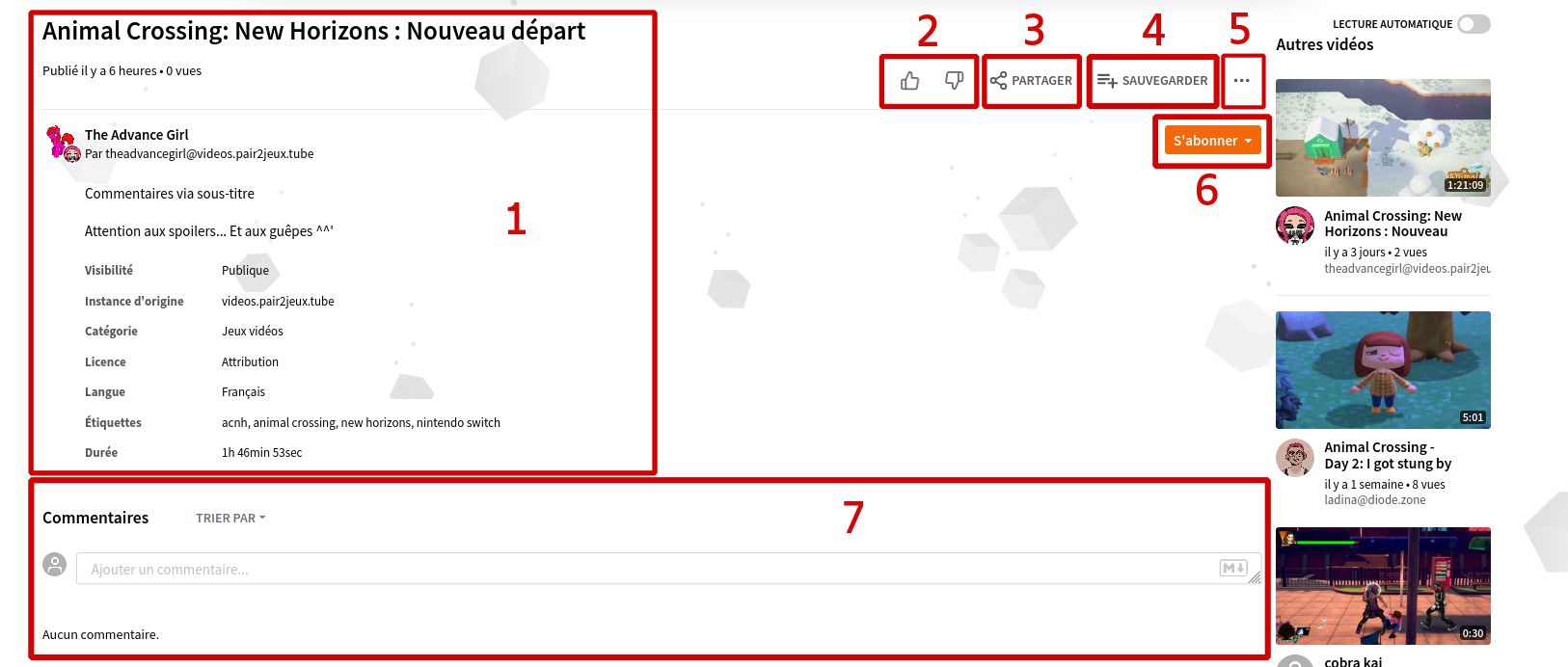 La partie haute est dédiée à la vidéo et la partie basse, aux informations liées à celle-ci (titre, définition, commentaires) ainsi qu’à une suggestion de vidéos à voir.