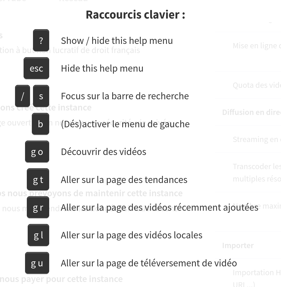 Enfin, différents liens d’accès rapide sont disponibles au bas de la colonne. Ils vous permettront d’accéder aux informations de contact, à l’aide, à la foire aux questions, aux statistiques et aux raccourcis clavier. Voici les raccourcis existants :
