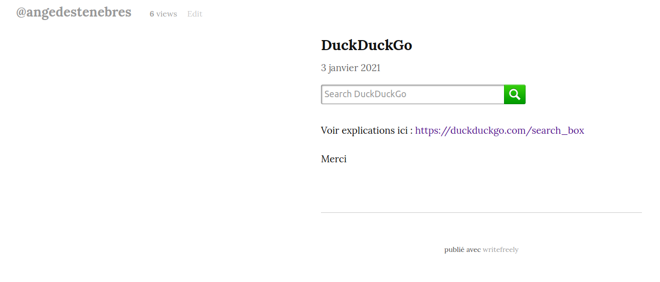 Grâce à DuckDuckGo, il est possible d’ajouter un moteur de recherche sur un blog. Cela peut être pratique lorsque l’on commence à avoir pas mal de contenu. Pour cela, il suffit d’utiliser la page suivante pour paramétrer celui-ci et insérer le code donné. Le résultat ressemblera alors à ceci :