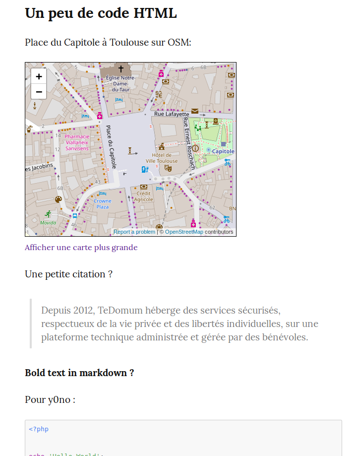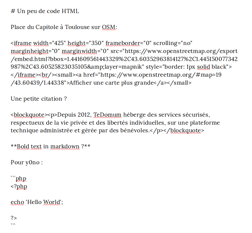 Il est possible d’utiliser le code HTML ou le Markdown ou encore de faire un mix des deux, comme on peut le voir ci-dessous :