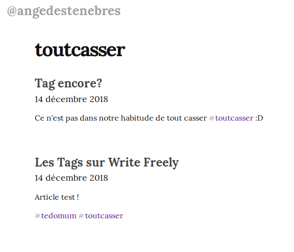 Il est possible d’utiliser des tags sur Write Freely. Pour cela, il suffit de mettre dans votre article # suivi du mot que vous souhaitez. Cela permettra de faire une liste de tous les articles ayant un sujet commun et de mieux référencer vos articles, notamment sous Mastodon.